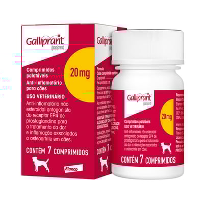 O Galliprant é apresentado em comprimidos de 20 mg, com opções de embalagens de 7 e 30 comprimidos, proporcionando flexibilidade na escolha conforme a necessidade do tratamento.