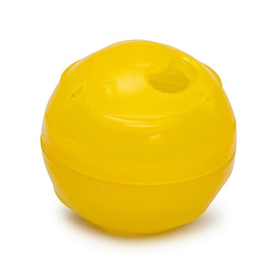 Para montar o brinquedo, basta abrir a bolinha girando as duas metades, inserir a ração ou petiscos no interior e fechar novamente. Ajuste a abertura de saída conforme o tipo e tamanho do alimento para regular a dificuldade do jogo.