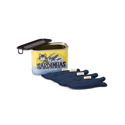 O brinquedo é composto por quatro sardinhas de feltro recheadas com catnip, uma erva conhecida por seus efeitos relaxantes e estimulantes em gatos. Estas sardinhas vêm em uma lata colecionável, tornando o conjunto não apenas um brinquedo, mas também um item de decoração exclusivo para os amantes de felinos. Cada sardinha é cuidadosamente feita à mão, garantindo um toque artesanal e único ao produto.