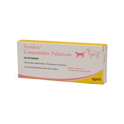 O Synulox 50 mg é indicado para o tratamento de diversas infecções em cães e gatos, incluindo aquelas que afetam a pele, o trato respiratório e o trato gastrointestinal. Este antibiótico é uma escolha confiável e de ação rápida para animais de estimação de todas as idades e portes. A embalagem contém 10 comprimidos palatáveis, facilitando a administração do medicamento sem causar desconforto ao animal. Seu principal diferencial é a combinação de amoxicilina e clavulanato de potássio, que juntos garantem uma ampla eficácia contra bactérias resistentes.