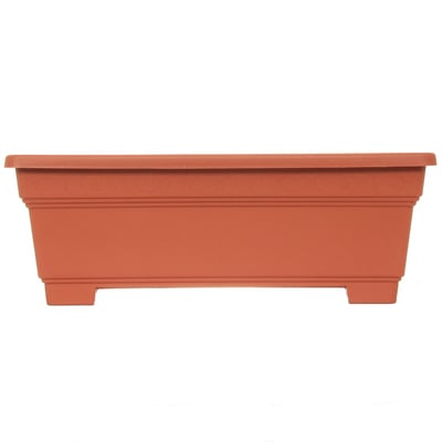 A floreira é feita de polipropileno, um plástico resistente que garante durabilidade e proteção contra os elementos.