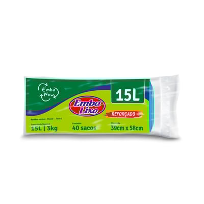 | Azul | Saco de lixo para ambientes | 15 L (3 kg) | Mais de 51% de material reciclado, polietileno de alta densidade, pigmento | 40 sacos por embalagem | 39 cm x 58 cm | 7898226516558 |