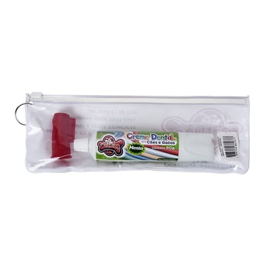 O uso regular deste conjunto de higiene bucal também contribui para o clareamento dos dentes dos pets, mantendo um sorriso saudável e bonito. Este kit é composto por um creme dental de 90g, uma dedeira para auxiliar na aplicação e uma prática bolsa plástica para armazenamento e transporte.