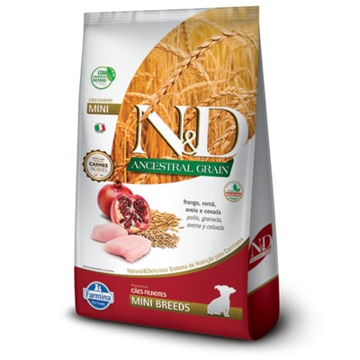 Ração farmina n&d ancestral grain para cães filhotes de raças pequenas sabor frango e romã