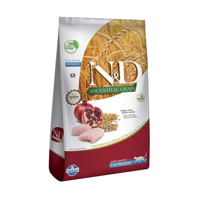 Ração farmina n&d ancestral grain para gatos castrados sabor frango e romã