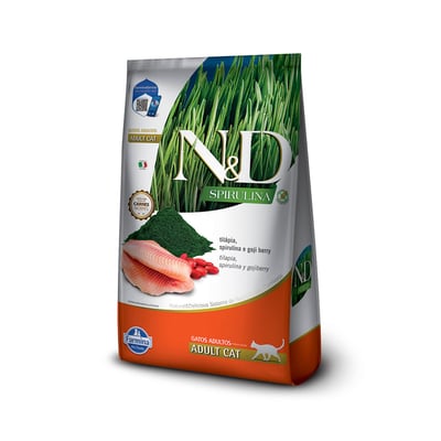 Ração farmina n&d spirulina para gatos adultos sabor tilápia, spirulina e goji berry