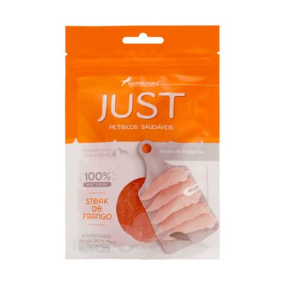 Disponível em embalagens práticas de 55g e 75g, o Petisco Just Steak de Frango é ideal para ser oferecido como recompensa ou mimo diário, promovendo momentos de alegria e satisfação tanto para o pet quanto para o tutor.