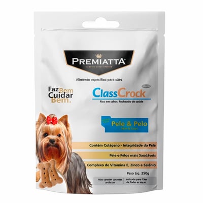 O Biscoito Premiatta ClassCrock é muito mais do que apenas um saboroso agrado para o seu cão. Com um foco especial na saúde da pele e do pelo, este petisco é enriquecido com colágeno, uma poderosa substância que contribui para a elasticidade e hidratação da pele, além de promover o crescimento de pelos mais fortes e brilhantes. O produto também desempenha um papel crucial na higiene bucal do seu pet, ajudando a controlar o tártaro e mantendo os dentes mais limpos e saudáveis.