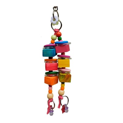 Feito com materiais seguros e duráveis, este brinquedo não só garante a segurança das aves, mas também a durabilidade do produto. A combinação de madeira de Pinus, miçangas de plástico, e cordão de algodão, tudo tingido com corante alimentício seguro, torna este pêndulo uma escolha confiável para os proprietários preocupados com o bem-estar de seus animais de estimação.