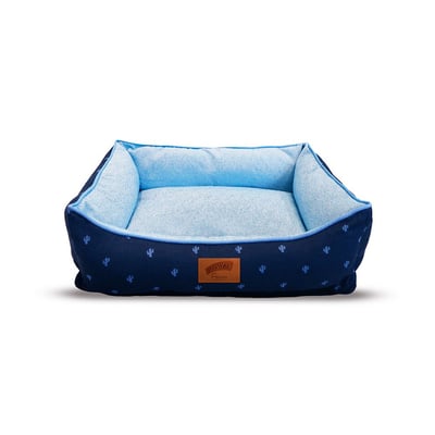 A cama está disponível na cor azul com estampado, conferindo um visual atraente e moderno.