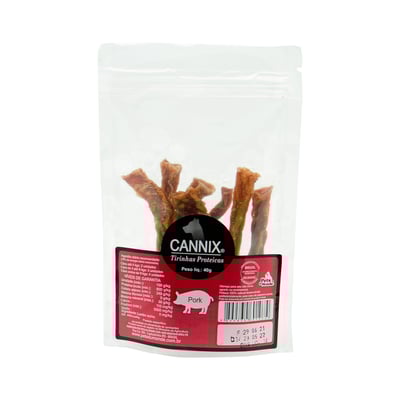 Os Snacks Cannix Tirinhas Proteicas Suínas Para Cães - 40G são petiscos deliciosos e nutritivos projetados para agradar paladares caninos exigentes. Com uma composição 100% natural, essas tirinhas são feitas de carne suína de alta qualidade e oferecem uma experiência de sabor excepcional para o seu amigo de quatro patas.