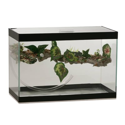 O destaque deste aquaterrário é sua cascata integrada, que não só agrega beleza ao ambiente, mas também oferece um elemento interativo para os animais. A cascata proporciona um som relaxante e umidade constante, fatores que são essenciais para o conforto e a saúde dos répteis. Com sua estrutura em vidro transparente, o terrário permite uma visualização clara dos animais, facilitando a observação e a interação.