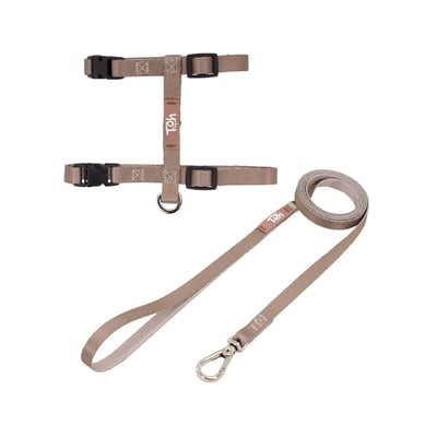 O peitoral é acompanhado de uma guia que se conecta facilmente à meia-lua do peitoral, garantindo que o gato esteja sempre sob controle do dono durante o passeio. Este produto vem em uma embalagem que contém tanto o peitoral quanto a guia, ambos na cor caqui, o que oferece uma aparência elegante e discreta.