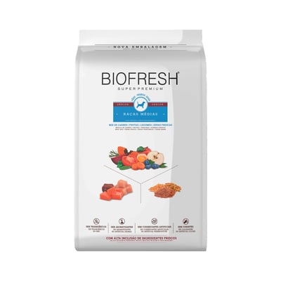 A ração Biofresh é super premium, com ingredientes frescos e sem corantes ou transgênicos, o que garante uma nutrição superior e mais natural.