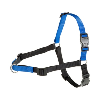 O sistema antipuxão é baseado em um anel dianteiro que, ao ser puxado, faz com que o cão se vire para o tutor, desencorajando o comportamento de puxar.
