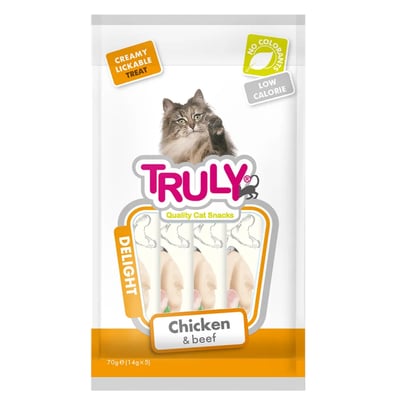 O Truly Creamy é um petisco inovador que combina o sabor suculento do frango e bife com uma textura cremosa que os gatos simplesmente adoram. Este produto é ideal para gatos adultos que apreciam um mimo extra em sua dieta, oferecendo uma experiência gustativa única que complementa a dieta cotidiana dos felinos. Além disso, ao ser livre de transgênicos e corantes artificiais, o Truly Creamy garante um consumo mais natural e saudável.