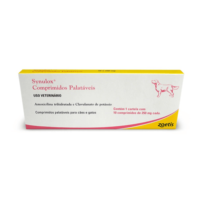 O Antibiótico Synulox 250mg para Cães e Gatos é uma solução eficaz e confiável desenvolvida pela Zoetis para tratar diversas infecções bacterianas em animais de estimação. Composto por Clavulanato de Potássio e Amoxicilina, este medicamento é reconhecido por sua ação antibacteriana de amplo espectro, eficiente no tratamento de infecções cutâneas, respiratórias, entre outras. A embalagem contém 10 comprimidos de 250mg, palatáveis e fáceis de administrar.