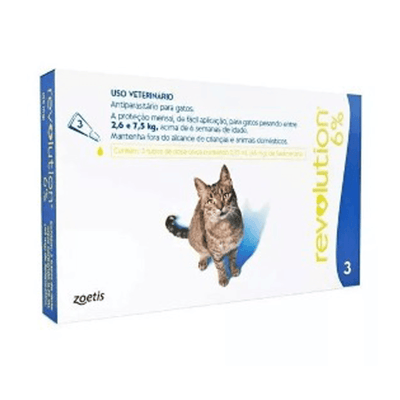 Antipulgas e carrapatos zoetis revolution 6% para gatos de 2.6 a 7.5 kg - 45 mg - 3 pipetas 3pip.