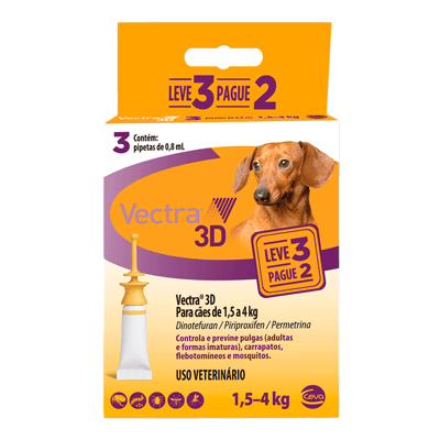 Antipulgas vectra 3d cães 1,5 a 4 kg ceva 0,8 ml leve 3 pague 2 - 3 pipetas