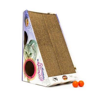 O arranhador é desenvolvido em papelão, um material ideal e atrativo para gatos.