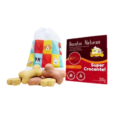 Os Biscoitos Naturais Sabor Bacon Padaria Pet Para Cachorros - 200G são a escolha ideal para quem busca oferecer um petisco não apenas delicioso, mas também nutritivo para seu cão. Com um sabor irresistível de bacon, esses biscoitos são uma explosão de sabor e saúde, além de serem sustentáveis, graças à sua embalagem reciclável.