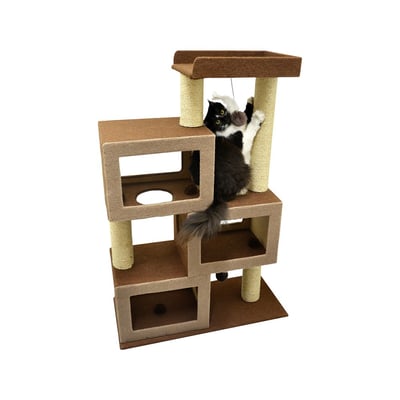 Disponível na elegante cor marrom, este arranhador se integra facilmente com qualquer decoração doméstica. Suas quatro plataformas proporcionam variados níveis de diversão, enquanto a combinação de materiais de alta qualidade, como tecido de fibra de PET, MDF, corda de sisal, bola de polipropileno e penas de ave, garante durabilidade e segurança para seu animal de estimação.