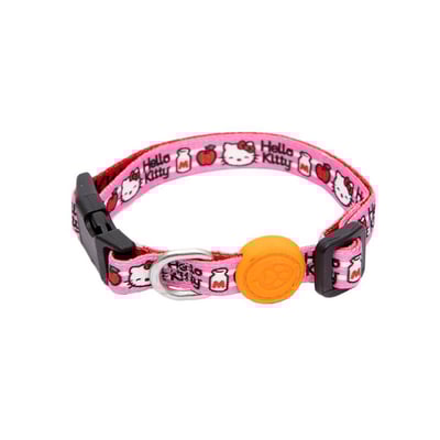 Atualmente, a coleira está disponível na exclusiva combinação de vermelho e estampado da Hello Kitty, oferecendo um visual único e encantador.