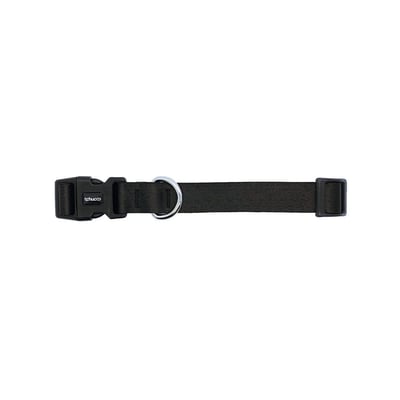 A coleira é feita de fita dupla face em poliéster, com componentes de nylon e metal, garantindo resistência e durabilidade.