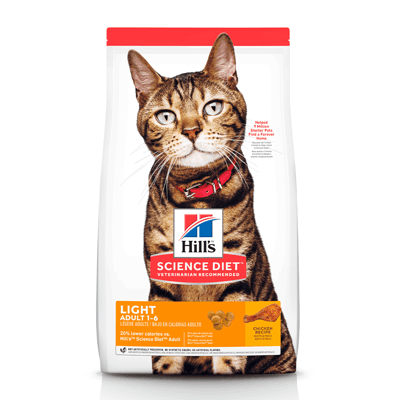 Hills Science Diet Light é uma ração premium projetada para gatos adultos de 1 a 6 anos que possuem um estilo de vida menos ativo. Com um delicioso sabor de frango, proporciona uma experiência alimentar que agrada até os felinos mais exigentes. O controle de peso é facilitado com uma fórmula que possui 23% menos calorias e é enriquecida com L-Carnitina, que auxilia no processo de queima de gordura e manutenção de massa muscular magra.
