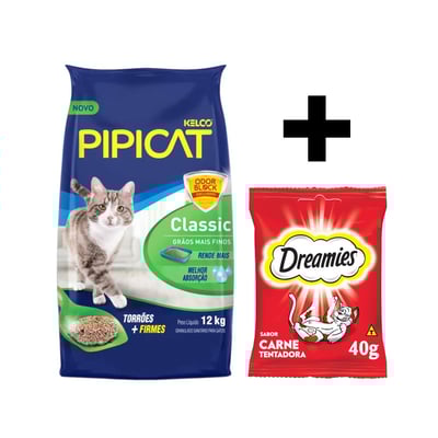 Kit Areia Pipicat Classic 12Kg + Petisco Dreamies Carne 40G Para Gatos Adultos - Compare ofertas e economize