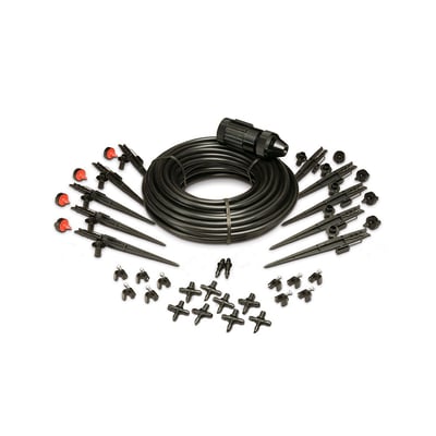| Componentes | 1 adaptador FHT 3/4 x 1/4, 7 m microtubo 1/4, 10 clipes de fixação, 8 tee 1/4, 2 uniões 1/4, 5 gotejadores 4 l/h, 5 gotejadores 8 l/h, 10 estacas 1/4 |