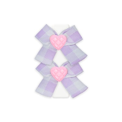 Este laço apresenta um aplique de coração que adiciona uma dose extra de charme. A estampa xadrez lilás é uma escolha inteligente para quem busca algo clássico, mas ao mesmo tempo moderno e alegre. Os laços podem ser colocados nos pelos ou diretamente nas orelhas dos pets, adaptando-se facilmente às suas necessidades.