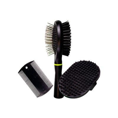 O Pet Grooming Kit Savana Preto é um kit especialmente desenvolvido para facilitar o processo de grooming de cães e gatos. Com uma escova dupla, um pente e uma escova de mão, este conjunto é perfeito para manter a higiene e a aparência do seu pet em dia. A escova dupla é ideal para desembaraçar os pelos e remover sujeiras superficiais, enquanto o pente ajuda a desmanchar nós mais difíceis e a escova de mão oferece uma massagem relaxante que também auxilia na remoção de pelos mortos.