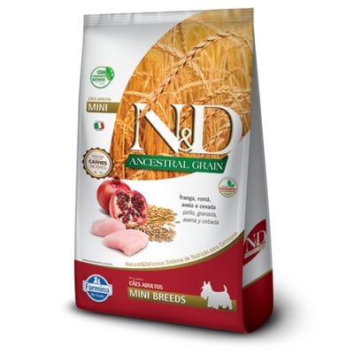 Ração farmina n&d ancestral grain para cães adultos de raças mini sabor frango e romã