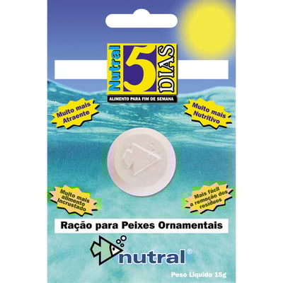 A Ração Nutral Fim De Semana - 5 Dias, 8G é a solução ideal para garantir que seus peixes ornamentais permaneçam bem alimentados e saudáveis, mesmo durante sua ausência. Projetada para oferecer nutrição de qualidade por até cinco dias, essa ração é a escolha perfeita para viagens ou períodos em que você não pode cuidar diretamente do seu aquário.
