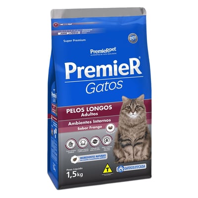 Ração premier gatos adultos pelos longos ambientes internos frango 1,5kg