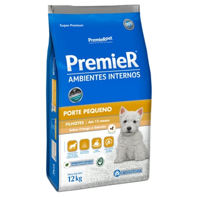 Ração premier pet ambientes internos cães filhotes frango e salmão 12kg