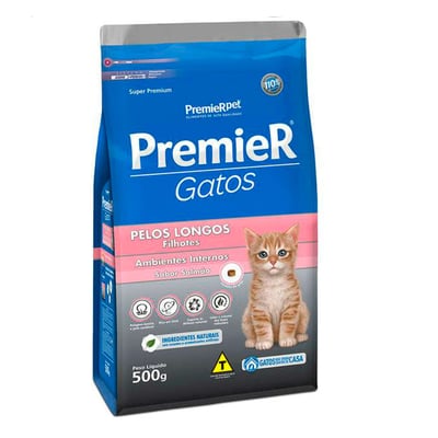 Ração premier ambientes internos gatos filhotes pelo longo salmão 500g