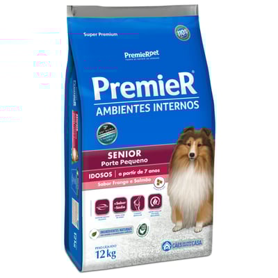 Ração premier ambientes internos sênior raças pequenas cães 7+ frango e salmão 12,0kg