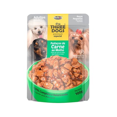 Ração Úmida Sachê Three Dog Carne Para Cães Adultos De Pequeno Porte - 100G - Compare ofertas e economize