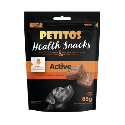 O Snack Petitos Health Active se destaca por sua formulação única que combina sabor, saúde e praticidade. É um petisco que não só agrada ao paladar do seu cão, mas também oferece benefícios terapeuticos e funcionais, graças aos seus componentes ativos e prebióticos.
