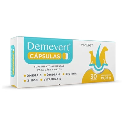 O suplemento Demevert é especialmente indicado para melhorar a saúde dermatológica de cães e gatos. Formulado com ômega 3, ômega 6, biotina, zinco e vitamina E, ele promove uma pele saudável e uma pelagem brilhante. Esses nutrientes desempenham funções críticas na manutenção e melhoria das condições de saúde do seu pet.